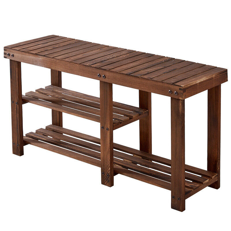 Equipped with three tiers of storage, the small shoe storage bench can carry multiple pairs of shoes at the same time. Fitted with solid wooden panels and a wide base, the shoe holder bench stands sturdily on any flat surface with ease.