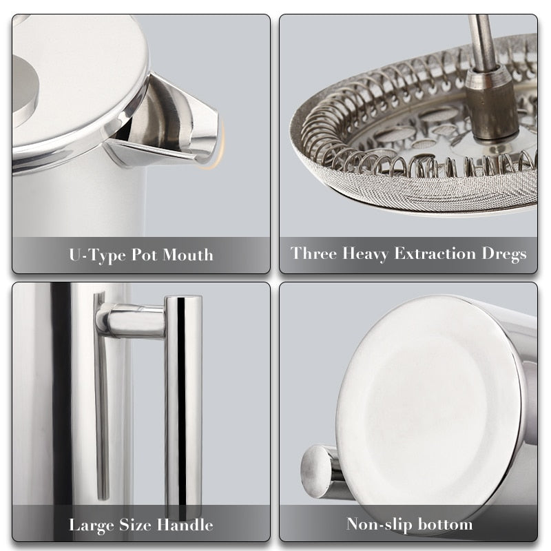 DURABLE STAINLESS STEEL - The french press coffee maker was made from high-grade 304 stainless steel that does not break, no rust, and keep the original taste. The double-walled insulation keeps drinks hotter for longer so you can enjoy every sip of your drink.